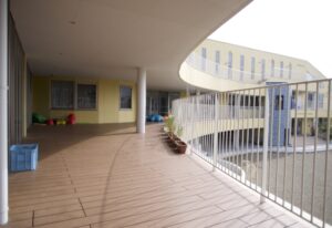 また、より良い保育を提供するという観点では、保育室の採光を考え扇状の配置を採り、さらに広いバルコニーで各保育室が一体感をもつような配慮をしています。